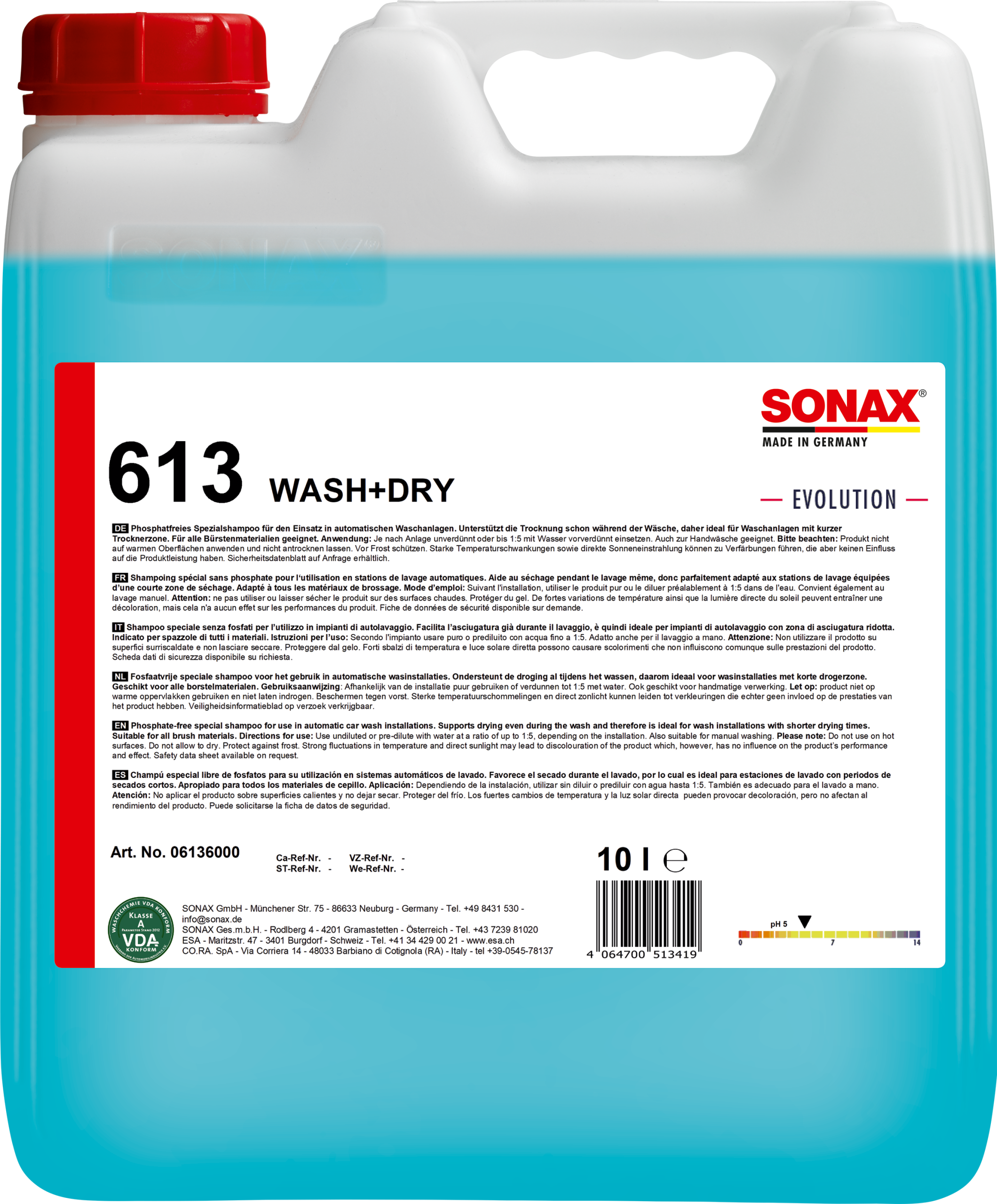 Specijalni koncentrat šampona s podrškom za sušenje za upotrebu u automatskim sustavima za pranje vozila ili ručno pranje. Proces sušenja se pokreće tijekom pranja, što proizvod čini idealnim za sustave s brzim vremenom protoka i kratkim zonama sušenja. Bez fosfata.