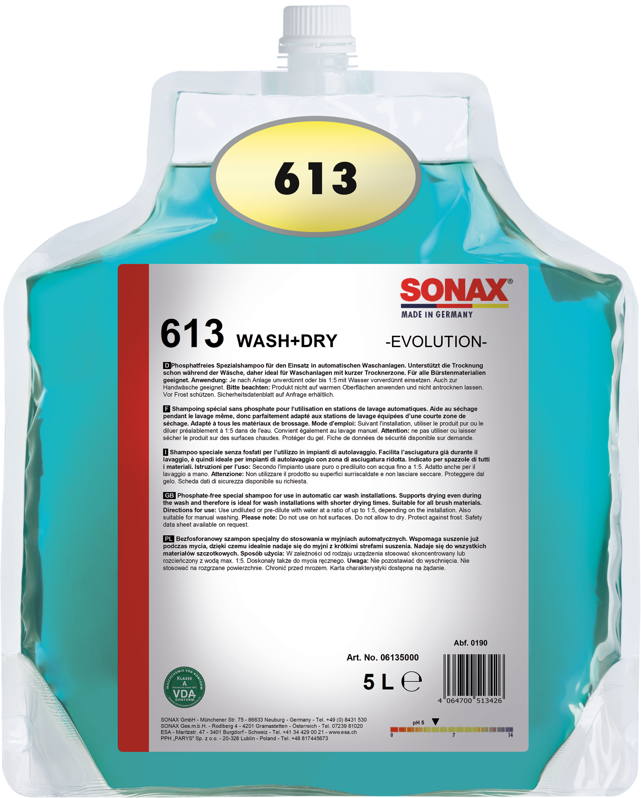 Specijalni koncentrat šampona s podrškom za sušenje za upotrebu u automatskim sustavima za pranje vozila ili ručno pranje. Proces sušenja se pokreće tijekom pranja, što proizvod čini idealnim za sustave s brzim vremenom protoka i kratkim zonama sušenja. Bez fosfata.