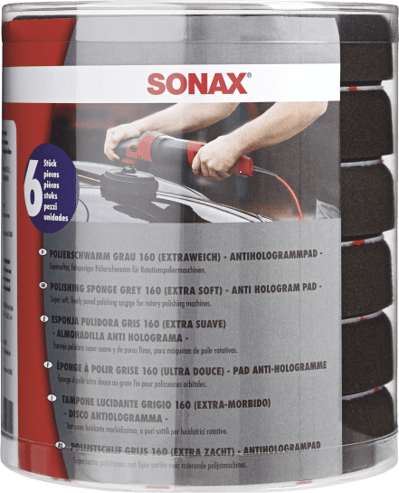 Supermeka spužva s finim porama za strojno poliranje laka SONAX PROFILINE sredstvima za poliranje pomoću rotacijskih strojeva. Brza zamjena jastučića zahvaljujući podlozi na čičak. Promjer 160 mm.