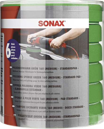 Srednje tvrda spužva s finim porama za strojno poliranje laka SONAX PROFILINE sredstvima za poliranje. Brza zamjena jastučića zahvaljujući podlozi na čičak. Promjer 160 mm.