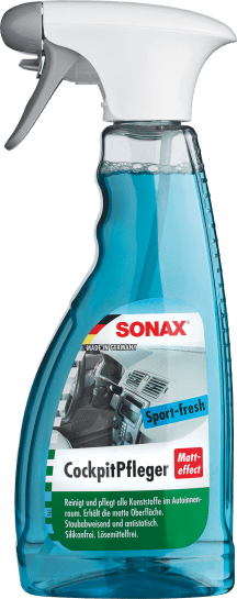 Sredstvo za njegu kokpita s mat-efektom čisti i održava sve plastične dijelove u automobilu. Djeluje antistatički, što znači da odbija prašinu i štiti plastiku od ponovnog onečišćenja. Ostavlja svjež miris. Sredstvo za njegu kokpita s mat-efektom posebno je pogodno za mat, strukturirane površine i drvene umetke. Zadržan je izvorni mat izgled kokpita, a izbjegavaju se nepoželjni odsjaji na vjetrobranu.